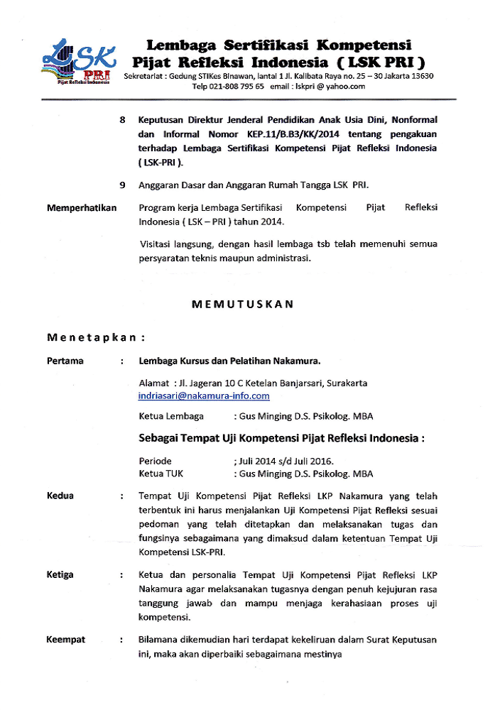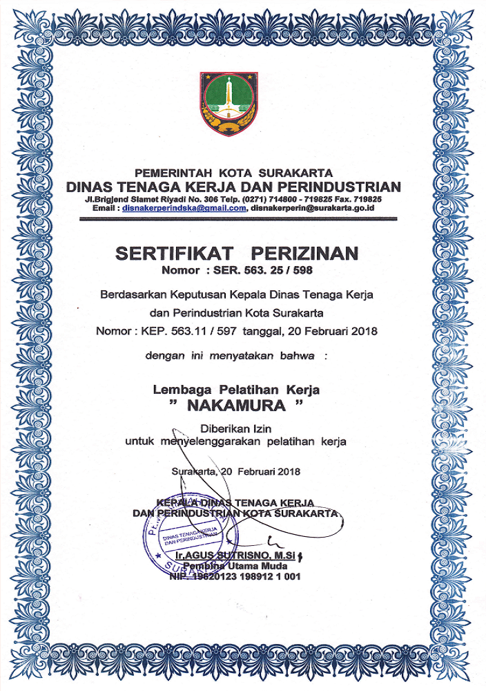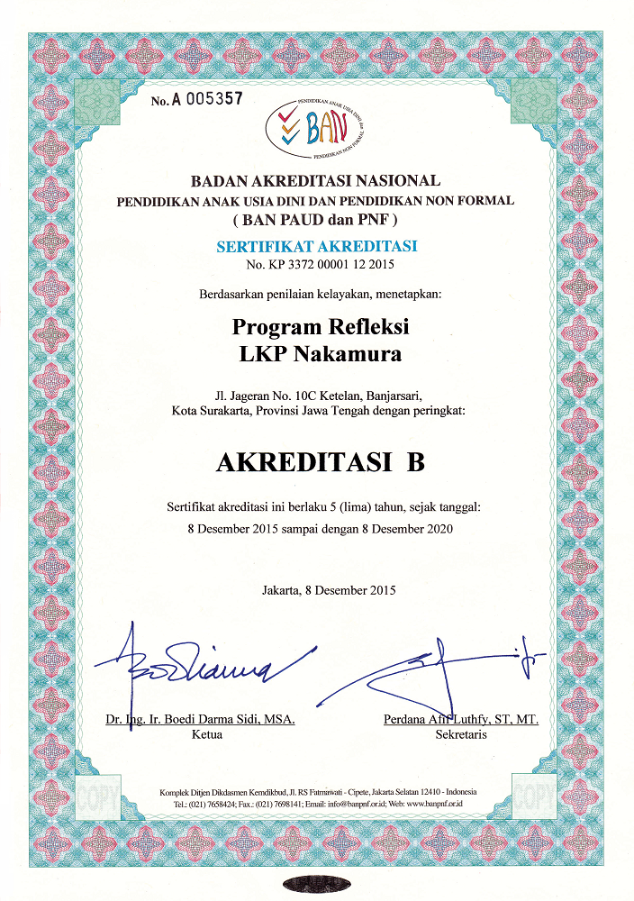 LPK Nakamura merupakan Lembaga pelatihan kerja yang sudah terakreditasi oleh BAN PAUD dan PNF serta terakreditasi oleh LA-LPK. LPK Nakamura memperoleh Juara 2 dalam program Apresiasi Lembaga Kursus dan Pelatihan Kategori: Vokasional dari Dinas Pendidikan Anak Usia Dini Provinsi Jawa Tengah. LPK Nakamura mempersiapkan tenaga yang handal dan kompeten di bidang refleksi, soft skill serta bahasa Jepang. Metode yang kami gunakan saat ini yaitu berbasis offline maupun online.